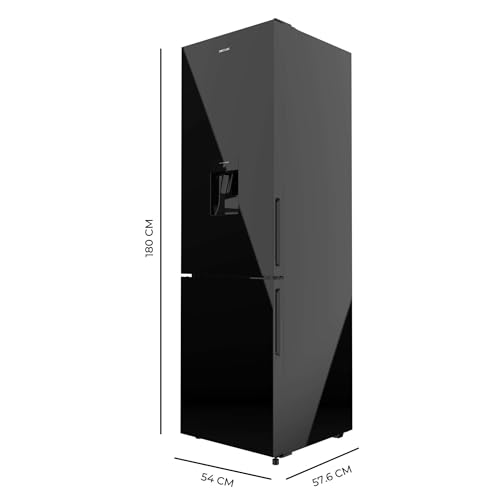 Détails: Réfrigérateur combiné en verre noir, 180 cm de haut et 55 cm de large, d'une capacité de 250 litres, compresseur Inverter Plus, Total No Frost, distributeur d'eau, classe énergétique D et avec système Multi Air Flow. De plus, il dispose d'un mode Fast Cooling et d'un tiroir Humidity Box avec régulation de l'humidité ainsi que d'alarmes d'ouverture de porte et de dysfonctionnement.