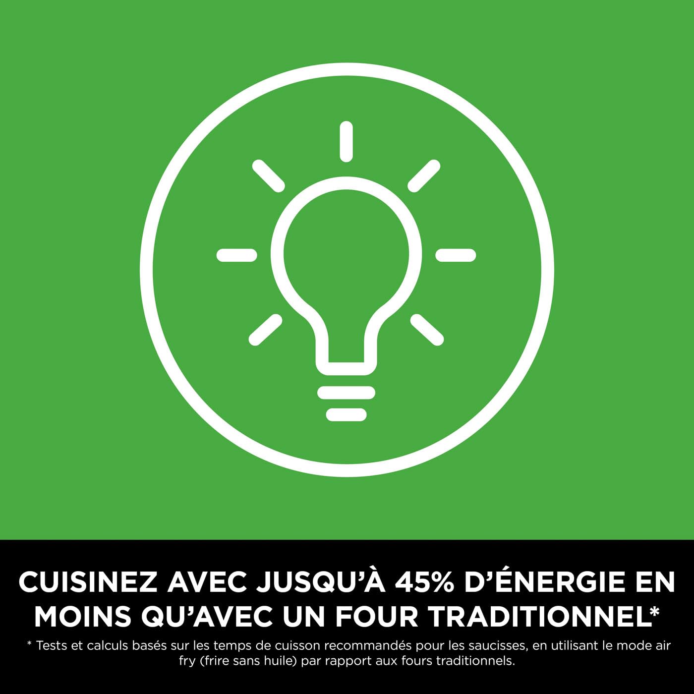 CUIRE EN UTILISANT JUSQU'À 45 % D'ÉNERGIE EN MOINS QU'UN FOUR* : (*Test et calculs basés sur le temps de cuisson recommandé pour les saucisses, en utilisant la fonction de friture à l'air par rapport aux fours conventionnels)