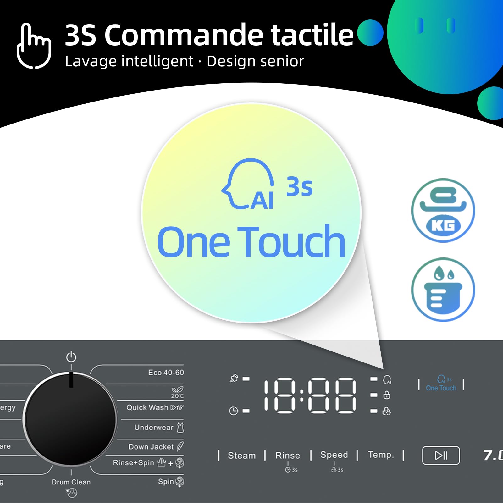 Solutions de Lavage Intelligent 15 programmes spécialisés (Soin Bébé / Laine / Délicats) + lavage rapide en 15 minutes pour s'adapter à tous les types de tissus. Démarrage rapide en 3 secondes avec une seule touche et ajustement automatique de l'eau pour des lavages efficaces.