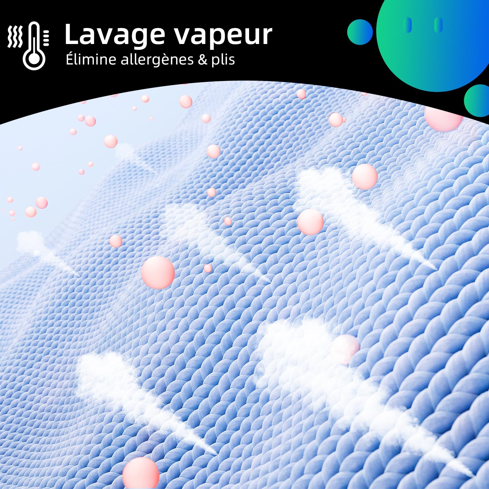 Technologie Steam Refresh La technologie de lavage vapeur pénètre les fibres pour éliminer les allergènes et les bactéries, idéale pour les peaux sensibles et les vêtements de bébé, avec un lavage à la fois doux et en profondeur.